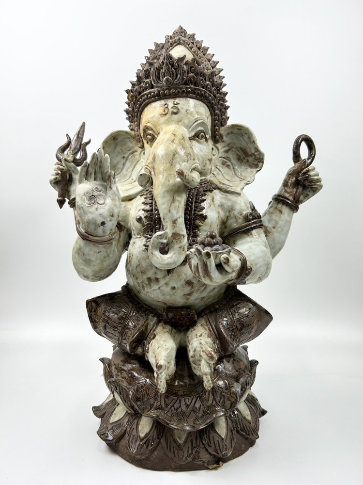 พระพิฆเนศ งานกระเบื้องดินเผาเคลือบโบราณ สีเขียวเข้ม ขนาดหน้าตัก 7 นิ้ว ขนาด ความกว้าง 23 เซนติเมตร x ความหนา 22 เซนติเมตร x ความสูง 31 เซนติเมตร