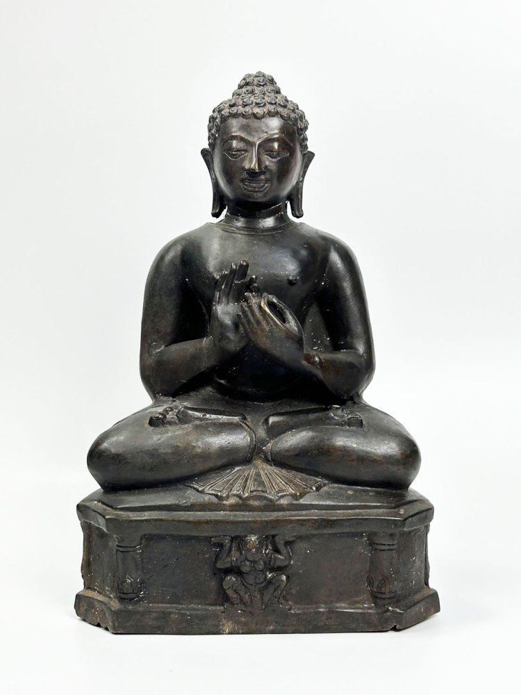 พระพุทธรูปปางปฐมเทศนา งานโลหะโบราณ ขนาดหน้าตัก 9 นิ้ว ขนาด ความกว้าง 24 เซนติเมตร x ความหนา 15 เซนติเมตร x ความสูง 36 เซนติเมตร