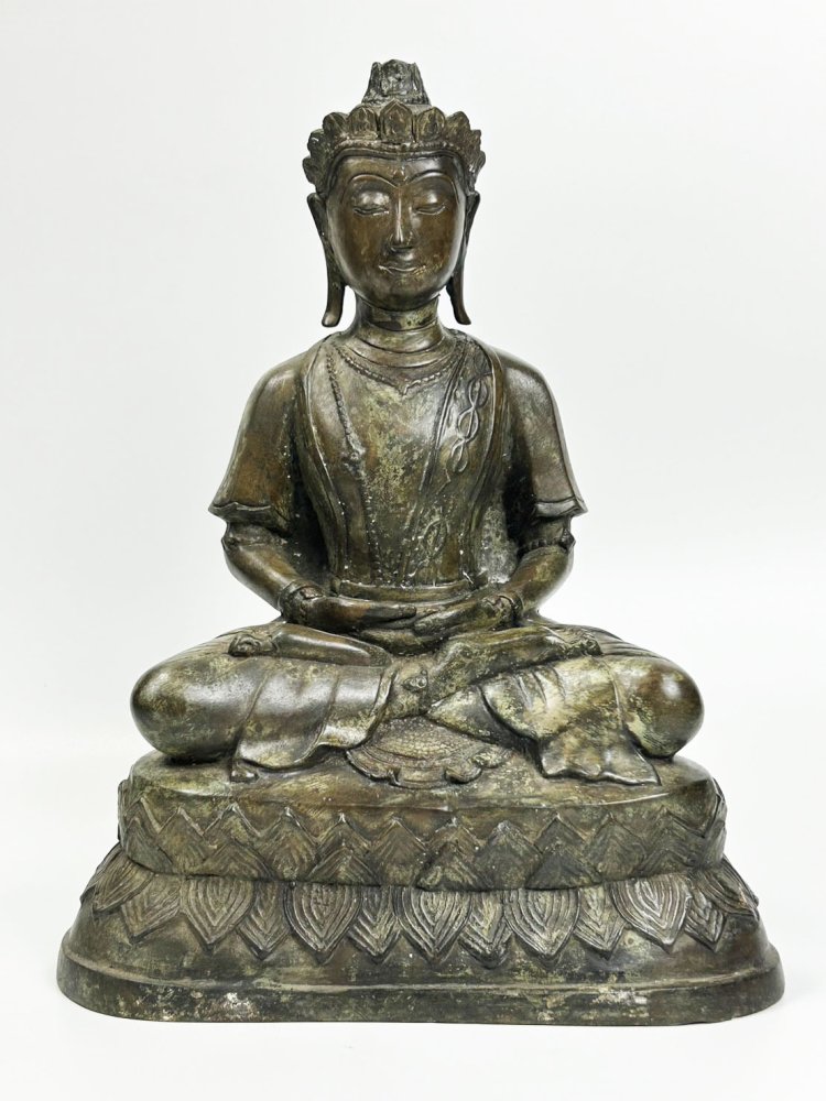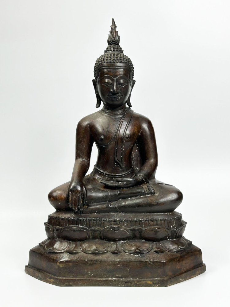 พระพุทธรูปปางสมาธิ งานโลหะโบราณ ขนาดหน้าตัก 9 นิ้ว ขนาด ความกว้าง 30 เซนติเมตร x ความหนา 17 เซนติเมตร x ความสูง 37 เซนติเมตร