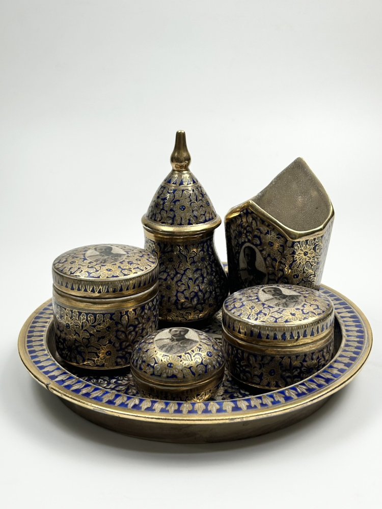 ชุดเครื่องใช้เบญจรงค์ ในชุดประกอบถ้วยถาดวางเครื่องใช้ 1 ชิ้น และเครื่องใช้ 5 ชิ้น วางบนถาด ขนาดความกว้าง 25.50 เซนติเมตร ความยาว 25.50 เซนติเมตร ความสูงรวม 17.00 เซนติเมตร
